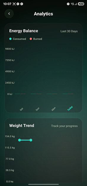 - Energy Balance: Monitor your "Daily Balance" of consumed vs. burned energy in real-time.